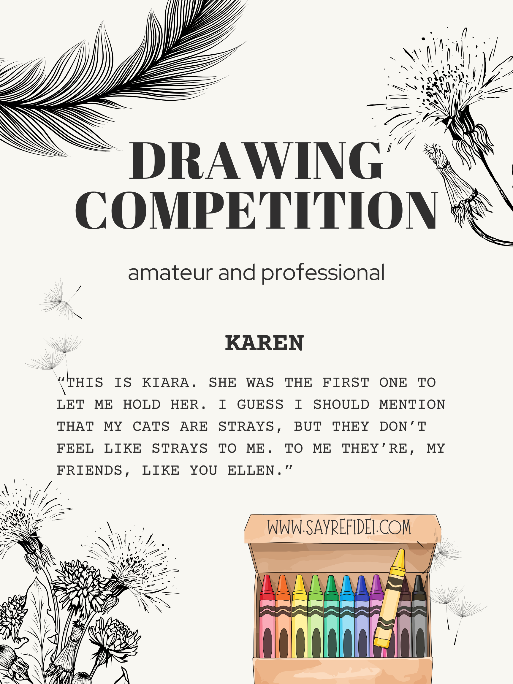 On page 21 of the book, Meet Karen: The Friend That Nobody Likes “BFF4L” Part I Sayre Fidei is seeking a crayon drawing of Karen’s stray purr furr friends that, if chosen, will be used and featured as Karen’s drawing for Ellen DeGeneres within the story.